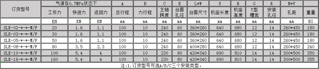 A-SLE 指產(chǎn)品系列 A:力行程可調 02 指工作壓力 B指上模安裝類型 100指總行程 10指力行程 MF指控制方式M:手按 F:腳踏